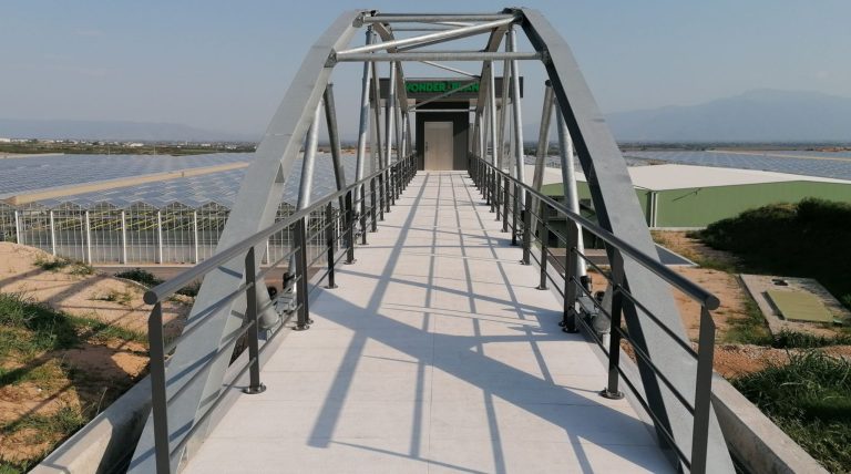 Κατασκευή μεταλλικού έργου, που περιλαμβάνει γέφυρα και κτίριο υψηλών προδιαγραφών.